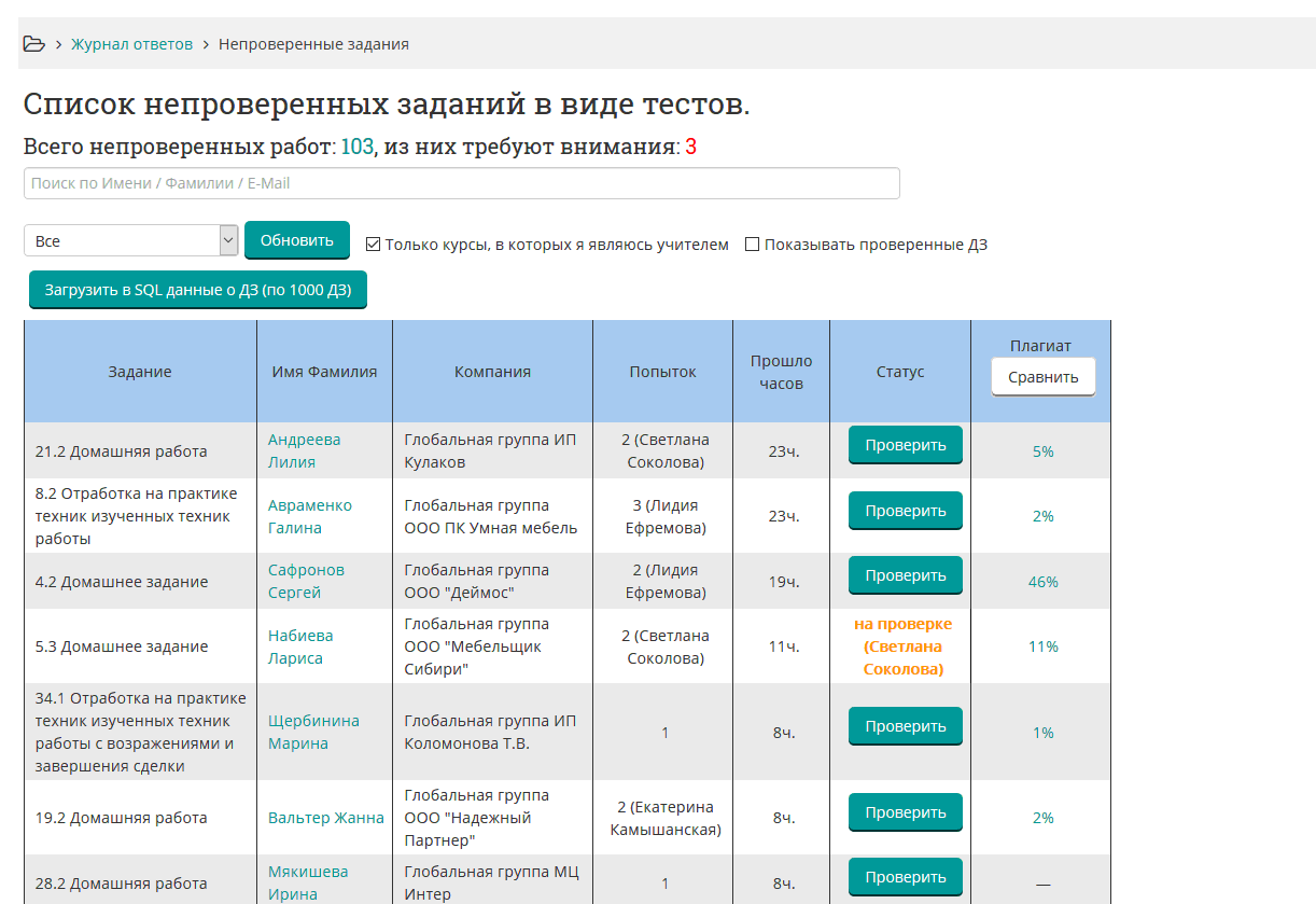 Добавлен столбец плагиат. В нем отображается степень похожести ДЗ. Если она больше 50%, то подсвечивается красным цветом. Если стоит "-" - значит ответ слишком маленький и в рассчетах не участвует. Нужно потестировать, от какого % имеет смысл подсвечивать степень похожести красным и визуально внимательней изучать данные работы на предмет плагиата.