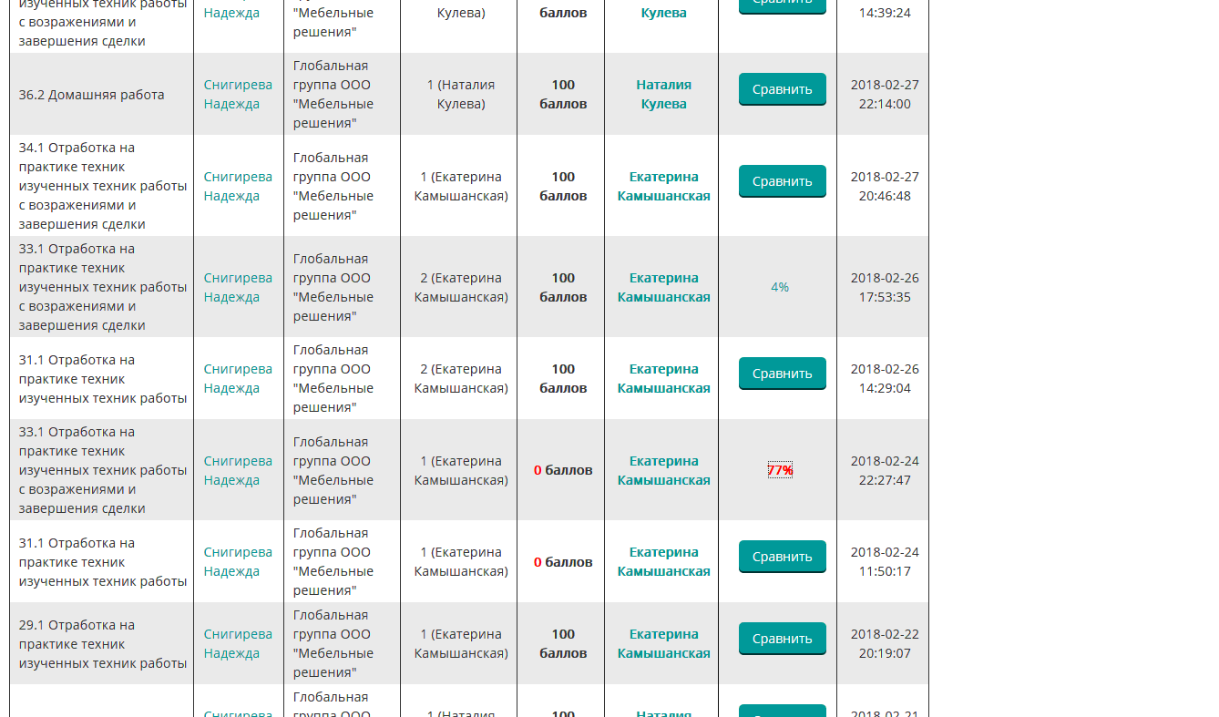 При нажатии на кнопку «Сравнить» в шапке таблицы (белого цвета) – будет произведен расчет степени похожести «пачки ДЗ» для непроверенных ДЗ. Если для всех ДЗ степеь похожести уже рассчитана - то ничего не произойдет. Оптимальный размер пачки будет подбираться опытным путем в течении нескольких дней. Пока он равен – 20 и рассчитывается в течении примерно 30 секунд.